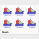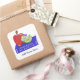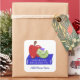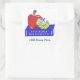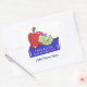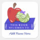 Book sticker with a green bespectacled bookworm sitting atop a blue book next to a red apple. This book belongs to is written on the spine of the book in white letters. Add your name in a charming blue script!