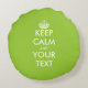 Cute apple green and white keep calm and your text round throw pillow. Personalizable template for making your own funny keep calm and carry on parody. Vintage keepcalm typography with little crown. Create your own keepcalmandcarryon spoof. Funny home decor for sofa couch or bed. Customise lime colour / colour. Double sided design.