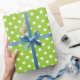 Apple green polka dots pattern wrapping paper. Custom background colour behind the white polkadots pattern. Cute giftwrap for Birthday, Wedding and Christmas Holiday presents. Change the quantity to get the cheapest price per roll. Polkadotted print wrappingpaper.