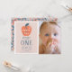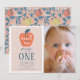 This cute "the apple of our eye" girl's 1st birthday photo invitation card features a red apple with navy blue leaf on a pink background framed by a white border. The reverse side features a coral pink background with floral apple patterns. Personalise it for your needs. You can find matching products at my store.