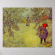 Swedish mother, daughter picking up apples at a farm. Fine art painting by Carl Larsson of the family harvest.
