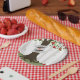 Plates featuring an illustration of an apple tree with banner wrapped around trunk. Personalise with names.