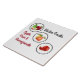 Apple, Pear & Pomegranate Design. Each fruit symbol is in a white circle of their own with a black frame. The words "Winter Fruits" are written in the upper, right-hand corner in black text to match the circle frames Each individual fruit is listed in red with a slight drop shadow along the borrom, left-hand border. Clean, uncluttered design. Perfect ceramic trivet for your winter kitchen!