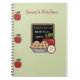 Use this cute and creative apple theme notebook to keep track of all your favourite, recipes, list or just a place to jot down notes. This apple themed notebook features a sage green background with a green plad spine wrapping just over the front edge and over the back of the book. The front shows a cute apple theme including apples, apple pie and a chalk board. Customise your notebook with your own text using the text wording template.
