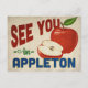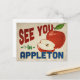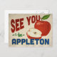 A charming Appleton Wisconsin vintage travel postcard featuring a lovely red apple, along with fun retro style text that says, "See you in Appleton"