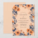 This design showcases a sophisticated color palette of deep navy blue and soft apricot watercolor blossoms. Rich blue foliage creates a striking contrast against the warm peach-toned background. Delicate floral sprigs and large blooms provide a romantic and artistic aesthetic. Perfect for a nature-inspired event, this artwork balances bold tones with elegant, airy details.