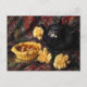 Feast your eyes on this beautiful postcard!. A homemade orange apricot tart in a delectable pastry shell is served on a glass plate accompanied by a navy blue teapot and three yellow gold carnation flowers. All are set on a lovely paisley fabric in shades of red, green, blue and purple. The fine art photography has been enhanced to produce the feeling of an old still life painting.