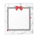 5.5” x 6” white notepad to match our “April in Paris” invitation and envelope with an image of a white square with a black and white checkered border, a pretty red bow, and a few ladybugs on a washed out image of black Eiffel Towers on white. See the entire Cancan Notepad collection in the PARTY FAVORS section.