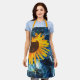 On this kitchen apron, a bright yellow sunflower looms large against a dark blue sky, an image reminiscent of a Van Gogh painting.