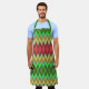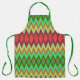 Apron with vibrant, geometric diamond patterns in red, green, and yellow. A smiling individual wears it over a blue shirt, conveying a cheerful tone.