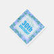 Beautiful abstract background (pastel colours: blue, light purple and turquoise) with a half-transparent white square tag (tiny transparent border) for name, date and birthday. All is customisable for these 30th birthday paper napkins.