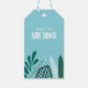 Tropical baby shower favour tag with tropical leaves in shades of aqua and green and wood grain reverse side.