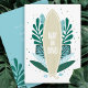 Surfs up! Tropical surf themed baby shower invitation with a natural wood grain surfboard and tropical leaves in shades of aqua blue and green.