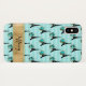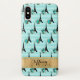 This stylish aqua blue, black, and gold floral Case-Mate Barely There iPhone X Case has a tone on tone aqua blue harlequin diamond pattern with a black Eiffel Tower pattern overlaid on top that have blue flowers trimmed in gold at their base. The case has a wide gold band across the bottom that is personalised with a name or other text.