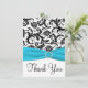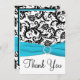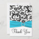This black and white damask Thank You card has an aqua blue PRINTED ribbon and PRINTED diamond jewel brooch that would be perfect for an aqua and black themed wedding. ****PLEASE NOTE if you change fonts, or the size of the font, some of the design and/or text may get cut-off. Everything will print as you see it on your monitor. I will not see changes you make, and Zazzle will NOT correct anything (typos, mis-alignment etc.). The text is all customisable. If you need help with this product, please email me BEFORE you place your order. If you require any other matching items, please email your request to niteowlstudio@gmail.com