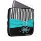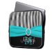 This personalised black and white striped laptop sleeve with an aqua blue FAUX ribbon and jewel brooch has text boxes for you to customise with your own name, monograms, business name, or other text. If you need any help customising, please email niteowlstudio@gmail.com.