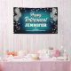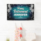 Fun banner sign for indoors or out, featuring festive silver metallic balloons on both sides of the design with sparkly, silver metallic confetti on a rich textured aqua blue background for your personalised retirement party banner.