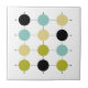 This mid century modern ceramic tile is bright and cheerful...add a little fun to your tiling project with this mid mod design featuring avocado green, aqua blue, black, and yellow circles, on black grid lines.