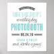 8 x 10" size custom wedding photo booth sign poster print can be personalised with bride and groom names and wedding date text. Sign reads "Welcome to Bride and Groom's wedding day photobooth, wedding date (xx.xx.xx), Grab a prop and strike a pose!". Aqua / turquoise blue, charcoal grey and white colours.