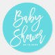 Customisable baby shower sticker featuring aqua blue hand-lettered script. Personalise by adding the event date or celebrant's name. Perfect for invitations and event favours. Other colours and matching items are available.