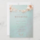 A dreamy aqua wedding invitation featuring soft 3D-effect peach-pink florals and copper text, perfect for spring or summer weddings.
