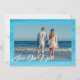 Save the date cards with ocean water design and big photo of the couple on the front. Horizontal, flat cards, with the option to download, have all wedding information on the back.