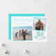 This beach inspired Christmas card features two framed photos, a white sand dollar and 2 white starfish on aqua blue glitter coral, and “Seas & Greetings” in a trendy handwriting script font.