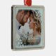 This modern and elegant christmas ornament design features a full bleed photo in a square frame with light aqua blue flower snowflakes at diagonally opposite corners and a script text with the words 'Our First Christmas' at the bottom.