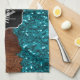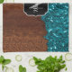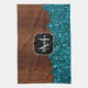 Aqua blue sparkles rustic brown wood Monogram Tea Towel