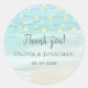 This wedding thank you sticker features a beautiful aqua blue beach scene of ocean waves crashing on the shore, accented with string lights.