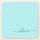Aqua Blue Teal Modern Script Girly Monogram Name Square Paper Coaster