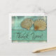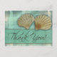 Close up of two sea shells against an aqua blue background and thank you in script font. .