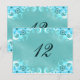 © Sunny Mars Designs - Floral Hibiscus: Dark Aqua Blue or Turquoise Wedding Table Number Cards - Beautiful, designer custom wedding reception table number card template with a modern, elegant illustration of a pretty, classy aqua blue swirly hibiscus floral decoration against a teal background.