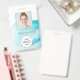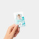 This badge has a aqua blue watercolor background and can be personalised with your name. The copy can be edited, and you can change the colour and font. Add your logo to the front, and a photo. On the back, add your company info, address, website, customer ID number, and QR code.