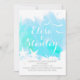Modern abstract aqua blue watercolor splash with starfish and seagulls beach wedding invitation featuring a hand painted watercolor paint splash with texture in tones of aqua blue and turquoise, two starfish and seagulls in white and text in white and grey. This elegant and stylish casual wedding design is a completely customisable template perfect for your summer beach or destination wedding. Note that this is only an image of watercolor and not real texture. For best results choose paper with texture.