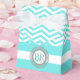 Aqua blue, white chevron zigzag pattern monogram wedding favour box featuring a chevron or zigzag pattern. Along the bottom part there is a turquoise band and your initials in a grey round frame with dots on a white stripe. This monogrammed trendy and cute girly favour box is perfect for other special occasions too such as bridal showers, birthday parties, baby showers etc.