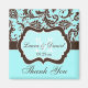 This aqua blue, brown, and white floral damask wedding favour thank you magnet matches the wedding invitation shown below. The text is all customisable.