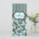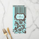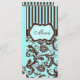 This monogrammed aqua blue, brown, and white stripes with floral damask menu card matches the wedding invitation shown below. It is designed on a rack card so the front is glossy and the back has a matte finish. If you would like a menu card on invitation paper to match your invitation, or if you have any requests for additional items or changes, please email niteowlstudio@gmail.com with your request.