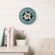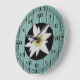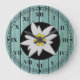 This round acrylic clock has graphics to give it an aqua wooden slat look, with a black round disc, in the middle, with graphics of a single large white Edelweiss flower. Roman numerals around the outside for an old fashioned look. Customise to add any text you want. Makes a great gift idea.