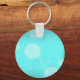 Painting of circles and bubbles that appear to be floating on a light blue green background, that looks cool and light, is printed on keychains. Can customise the key chain with your own text.