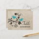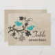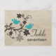 Sweet and whimsical Floral Lovebirds Table Number Postcard featuring a cascade of flowers on a swirly vine and a pair of turquoise lovebirds with a vintage look textured digital art background in beige. This lovely wedding table card is perfect for a spring or summer wedding. Easy to customise, simply add the appropriate table number(s) in the text field provided. Click "Customise It" to find more personalisation options.