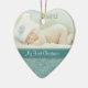 This holiday keepsake ornament features your own baby photograph, with a bottom border of elegant aqua blue floral swirl. A darker teal banner holds your customized text; make it say whatever you'd like! The back of the ornament has the same aqua floral swirl pattern and teal banner with additional text. This makes a nice keepsake gift for new parents.