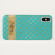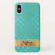 This stylish aqua blue and gold Case-Mate Barely There iPhone X Case has a pattern of small gold crowns and teal blue polka dots on it that are sure to be a standout! The case has a wide gold band across the bottom that is personalised with a name or other text.