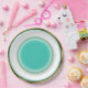 The design on this wonderful, unbreakable 10" dinner plate, created by Leslie Sigal Javorek, with it's triple-ringed rim of gold, black & aqua on white, and its' subtle, intriguing central image reminiscent of a lunar eclipse, is elegant in its' simplicity and somehow evokes a calming effect.