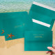 Whimsical modern sea ocean beach wedding invitation envelope in blue teal with starfish and faux gold sand typography script. Perfect choice for a modern beach, seaside, oceanfront, coastal, tropical, nautical, cruise or island destination-themed wedding.