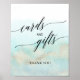 This aqua and gold watercolor beach cards and gifts sign is perfect for a tropical destination wedding or bridal shower. The simple and modern design features stunning turquoise, teal and light blue watercolor with a soft gold sparkle reminiscent of the sand and sea. It's paired with gorgeous elegant calligraphy. The line of text at the bottom of the sign can be personalized with the date, the names of the bride and groom, or a short message like "Thank you". This sign can be used for a wedding or any event or party.