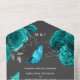 A beautiful all-in-one luxurious and glam invite featuring aqua blue and turquoise butterflies flitting across a dark grey background that has deep teal blue roses edged with faux silver sprigs. The outside is a delicate pastel grey colour and the lift up flap has the same blue with delicate floral design. The bottom third has a tear off response card with personalised rsvp address and meal options for your guests to complete. These are ideal for a spring; summer; fall or winter wedding; for a blue, grey and silver theme party or for a luxurious and elegant themed wedding anniversary celebration.