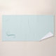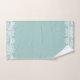 Pretty bath towel set done in light and medium aqua and white featuring polka dots and stripes and pretty white graphics of lace, on the hand towel. The polka dot bath towel has a large aqua one letter monogram ready to personalise. Great gift idea for any occasion.