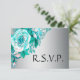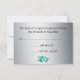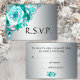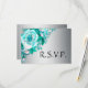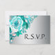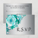 This contemporary silver and aqua wedding RSVP features a pretty aqua (or teal - with a hint of pink) rose bouquet in the top left hand corner. In the background there is a shiny silver metallic base. The reverse also has a tiny aqua rose bouquet at the bottom of the card.