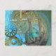 Fantasy digital graphic features a snail shaped Steampunk time travel machine with abstract aqua background